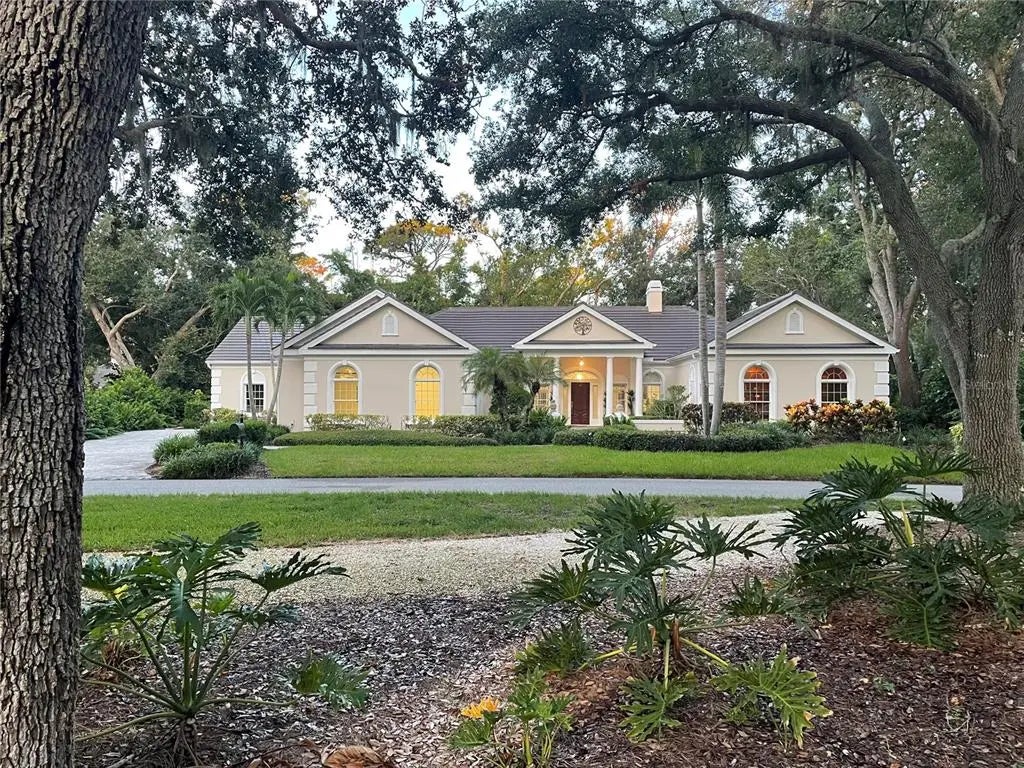 Under contract-accepting backup offers. This is your rare chance to claim a spectacular estate in Sarasota’s premier golf and country club community THE OAKS. This elegant home seamlessly blends timeless architecture with resort-style living. Beyond the private gates, step into over 4,000 square feet of refined interiors featuring dramatic ceilings, architectural columns, and panoramic views. The expansive layout includes 4 bedrooms, 5 bathrooms, formal and casual living spaces, and an executive Office/Den/Bourbon Tasting Room. The gourmet kitchen is perfectly equipped for culinary entertainment, with custom cabinetry, premium appliances, and a spacious island that flows into the family room. A luxurious owner’s suite provides a private sanctuary with jetted bath, 3 walk-in closets, and direct access to the pool terrace. Outdoors, your personal retreat awaits: a heated pool and spa, covered dining and lounge areas, separate firepit area, and tropical landscaping. Membership to The Oaks Country Club is mandatory. You can decide on a Social Membership or a Full Golf Equity Membership. Details attached. Club amenities include: 36 holes of golf, tennis, pickleball, croquet, 3 dining options, fitness, community pool/spa. Situated minutes from world-class beaches, fine dining, and downtown Sarasota’s cultural attractions. Make this your new home in Paradise! Crypto currency offers considered. Call for more information.