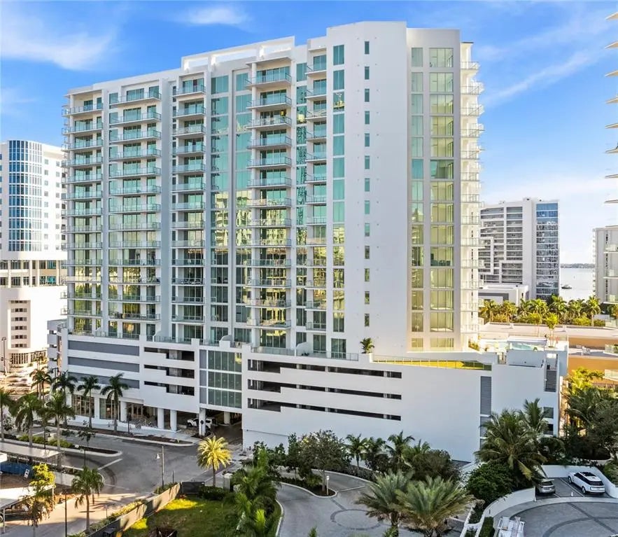Under contract-accepting backup offers. One or more photo(s) has been virtually staged. Welcome to Bayso, the epitome of luxury living in Downtown Sarasota's vibrant Sarasota Quay. Perched on the 12th floor, this premier condominium presents breathtaking views of Sarasota Bay and Sarasota Bay Park from every living space, bedroom, and the expansive lanai. With a meticulously designed floor plan, this residence boasts 2 bedrooms, a den, and 3 full bathrooms, creating an inviting space for both residents and guests. Upon entering, the panorama of the 12th-floor skyline immediately captures your attention, setting the tone for a residence that seamlessly blends indoor and outdoor living. The thoughtfully crafted open floor plan leads to a generously sized lanai that spans almost the entire width of the condo, maximizing the stunning views. The kitchen, a focal point of modern elegance,features European-inspired cabinets, quartz countertops, an oversized undermount sink, a large breakfast bar, and top-of-the-line stainless steel appliances. The master bedroom suite is a sanctuary of tranquility, offering not only breathtaking views but also designer touches with a modern farmhouse door, dual undermount sinks, a frameless shower, and a spacious walk-in closet with ventilated wood shelving. The guest suite provides privacy with its own ensuite bath, while the den serves as a versatile space for work, hobbies, or entertainment. Bayso doesn't just stop at the exceptional living spaces; it extends to an array of upscale amenities. A state-of-the-art fitness center and movement room, a stylish splash lounge with a catering kitchen, a community recreation area with a pool and spa, and a pergola-covered grilling station with picturesque views are just a few highlights. The condominium also features a dog park on the amenity level. The club room with a catering kitchen,conference rooms, and a well-designed lobby with a 24-hour attendant are located on the first level. Ensuring convenience, the property includes two parking spaces, owner storage on the first level, and bicycle storage. The Bayso condominium is not just a residence; it's a lifestyle,providing a luxurious haven close to downtown amenities, shopping, dining, and the beauty of St. Armands Circle and Lido Beach. Discover urban living at its finest in this premier Sarasota Quay address.